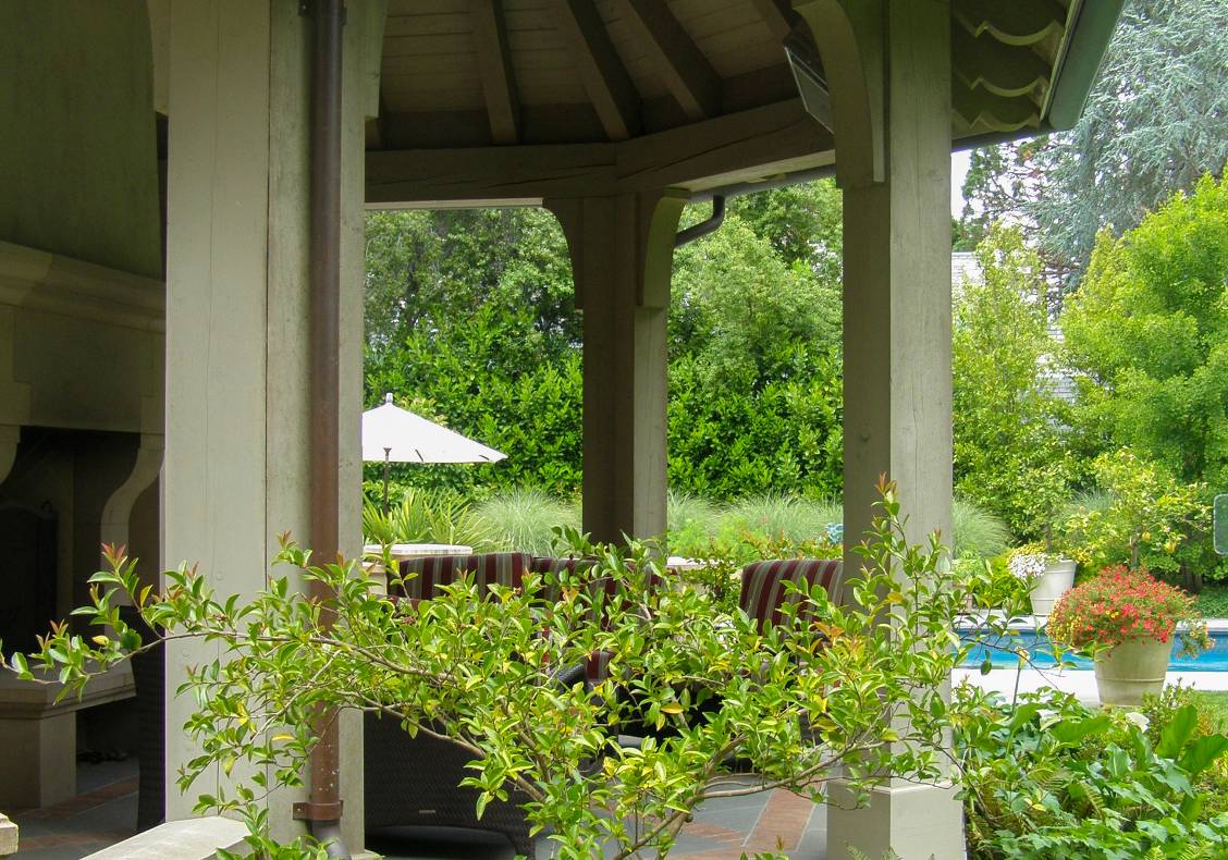 This country home is built in the character of a Lutyens English country home. The home is organized around the entry hall, with living room, library, and dining room opening off of this light, soaring space. A family wing extends into the garden like setting, with a heavy timbered wood paneled tall gabled family room and covered porch extending into the garden like setting.
